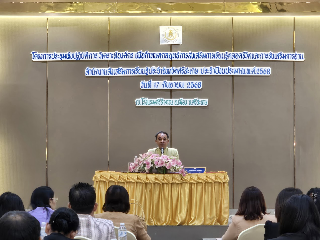 วันที่ 17 กันยายน 2568 นางวาสนา ชารีวัน ผู้อำนวยการศูนย์ส่งเสริมการเรียนรู้ระดับอำเภอกันทรลักษ์ พร้อมด้วย นางสาวภัทราภรณ์ ชัยสำโรง บรรณารักษ์ปฎิบัติการ และนางสาวพรณภา ลาธุลี บรรณารักษ์จ้างเหมา เเข้าร่วมโครงการประชุมเชิงปฏิบัติการ วิเคราะห์องค์กร เพื่อกำหนดกลยุทธ์การ เสริมการเรียนรู้ตลอดชีวิตและการส่งเสริมการอ่าน สํานักงานส่งเสริมการเรียนรู้ประจําจังหวัดศรีสะเกษประจําปีงบประมาณ พ.ศ. 2568 โดยมีนายณัฐพงษ์ ทองหล่อ ผู้อำนวยการ สกร.ประจําจังหวัดศรีสะเกษ เป็น ประรานในพิธีเปิด ณ โรงแรมศรีลำดวน จําเภอเมืองศรีสะเกษ จังหวัดศรีสะเกษ