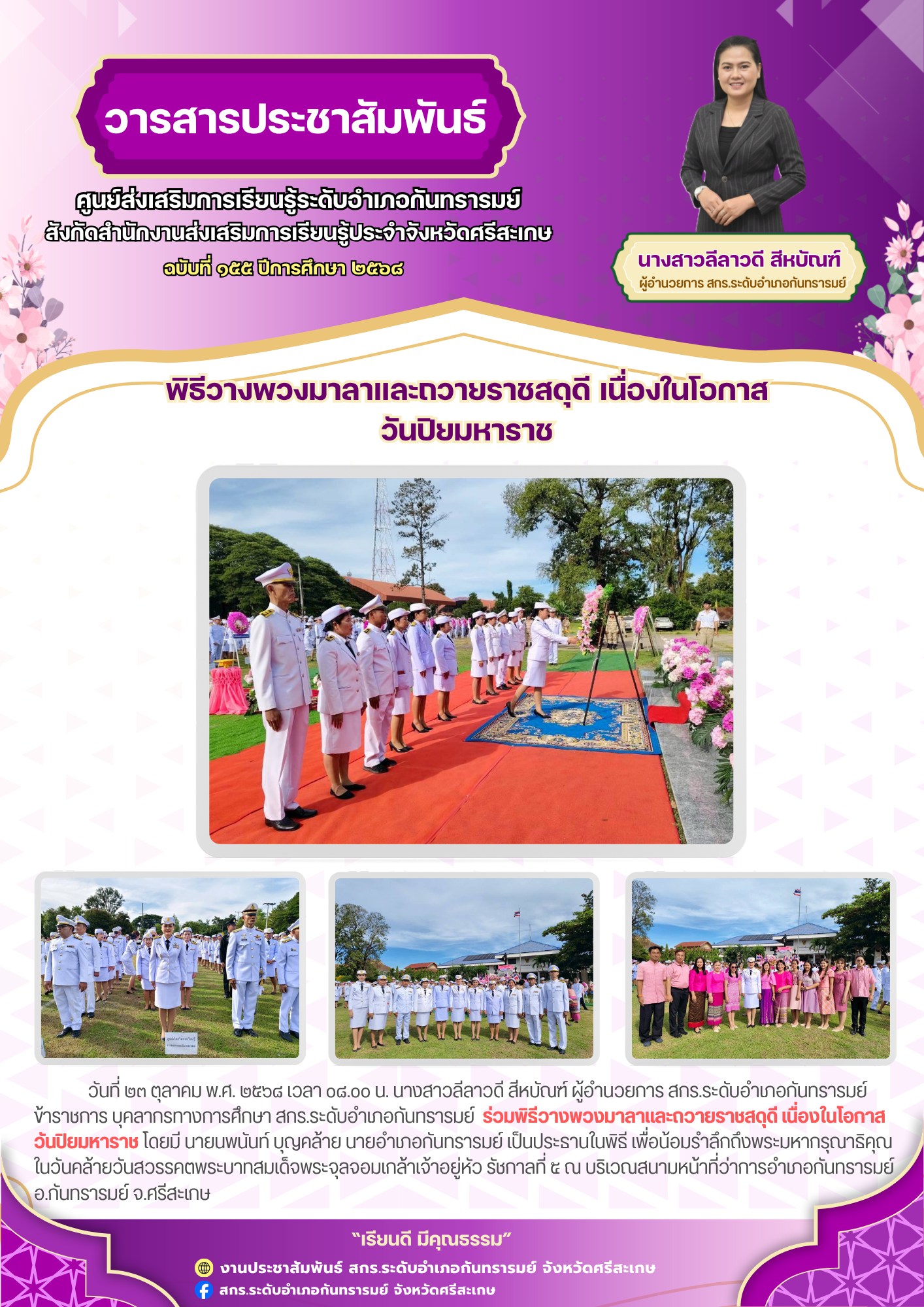 วันที่ ๒๓ ตุลาคม พ.ศ. ๒๕๖๘ เวลา ๐๘.๐๐ น. นางสาวลีลาวดี สีหบัณฑ์ ผู้อำนวยการ สกร.ระดับอำเภอกันทรารมย์ ข้าราชการ บุคลากรทางการศึกษา สกร.ระดับอำเภอกันทรารมย์ ร่วมพิธีวางพวงมาลาและถวายราชสดุดี เนื่องในโอกาสวันปิยมหาราช โดยมี นายนพนันท์ บุญคล้าย นายอำเภกันทรารมย์ เป็นประธานในพิธี เพื่อน้อมรำลึกถึงพระมหากรุณาธิคุณในวันคล้ายวัสวรรคตพระบาทสมเด็จพระจุลจอมเกล้าเจ้าอยู่หัว รัชกาลที่ ๕ ณ บริเวณสนามหน้าที่ว่าการอำเภอกันทรารมย์ อ.กันทรารมย์ จ.ศรีสะเกษ